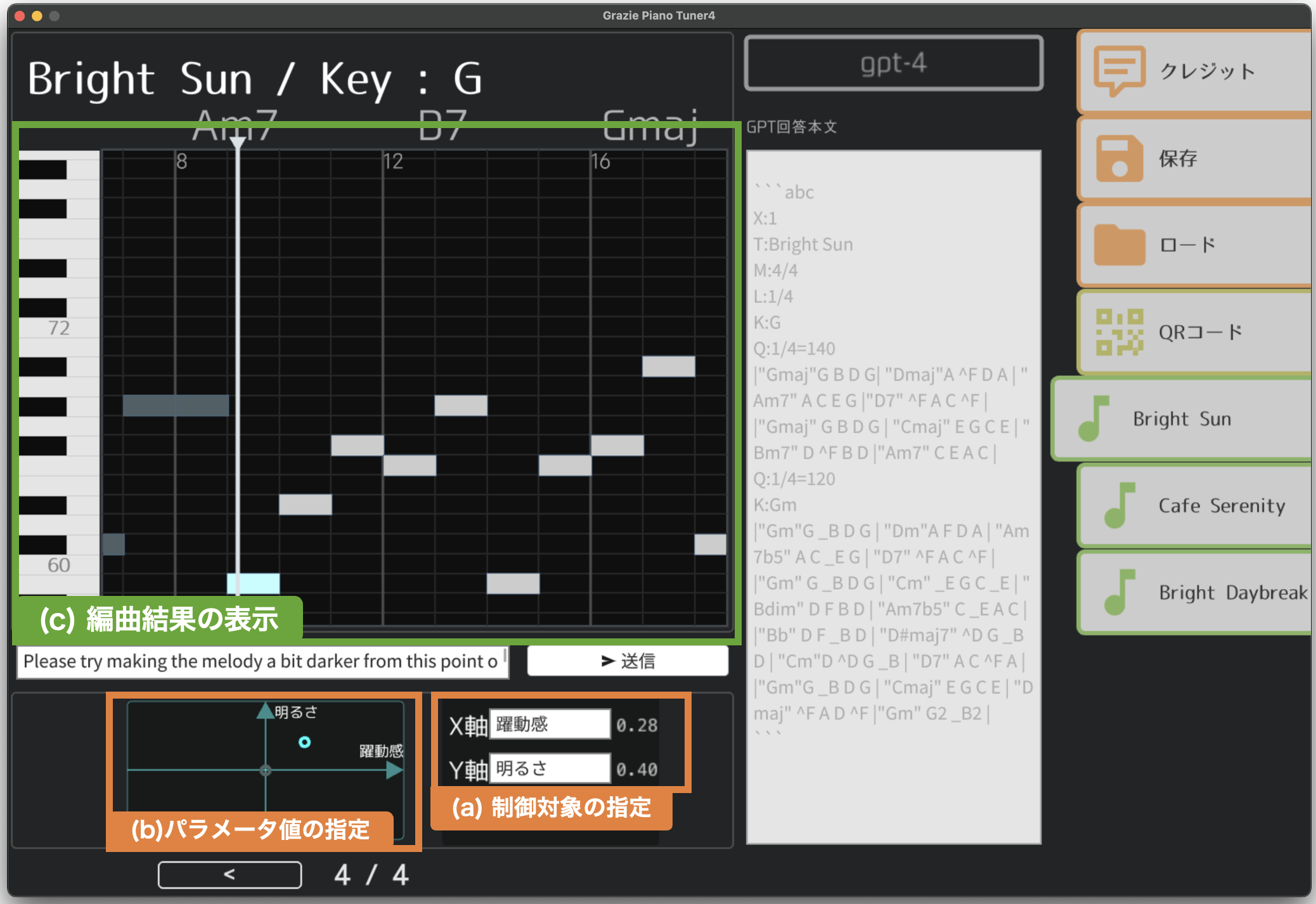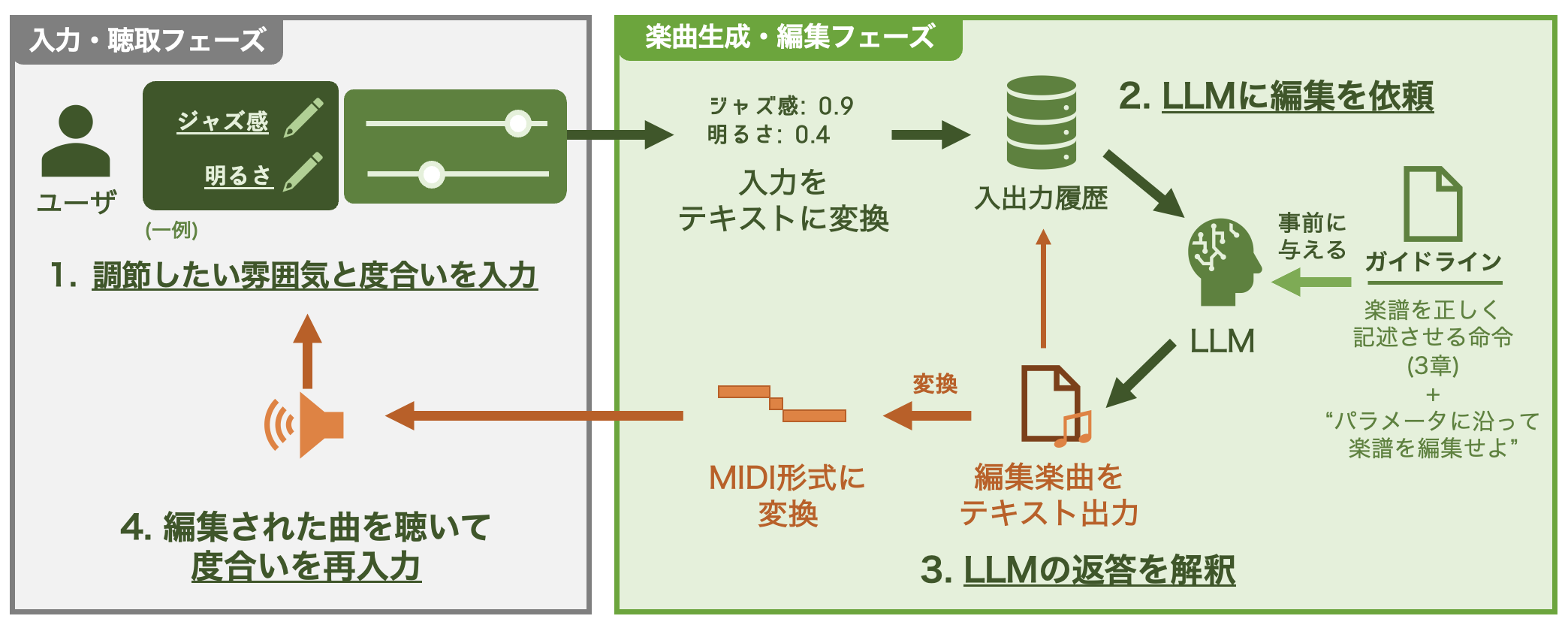 本システムでは、ユーザの指示に合わせて、メロディとコード進行からなる楽曲を生成・編集できる。 その手段として提供されている可変概念パラメータは、楽曲の調節したい雰囲気(例: 明るさ・ジャズ感)をテキスト形式で指定したり、その強度を数値で設定したりできる。