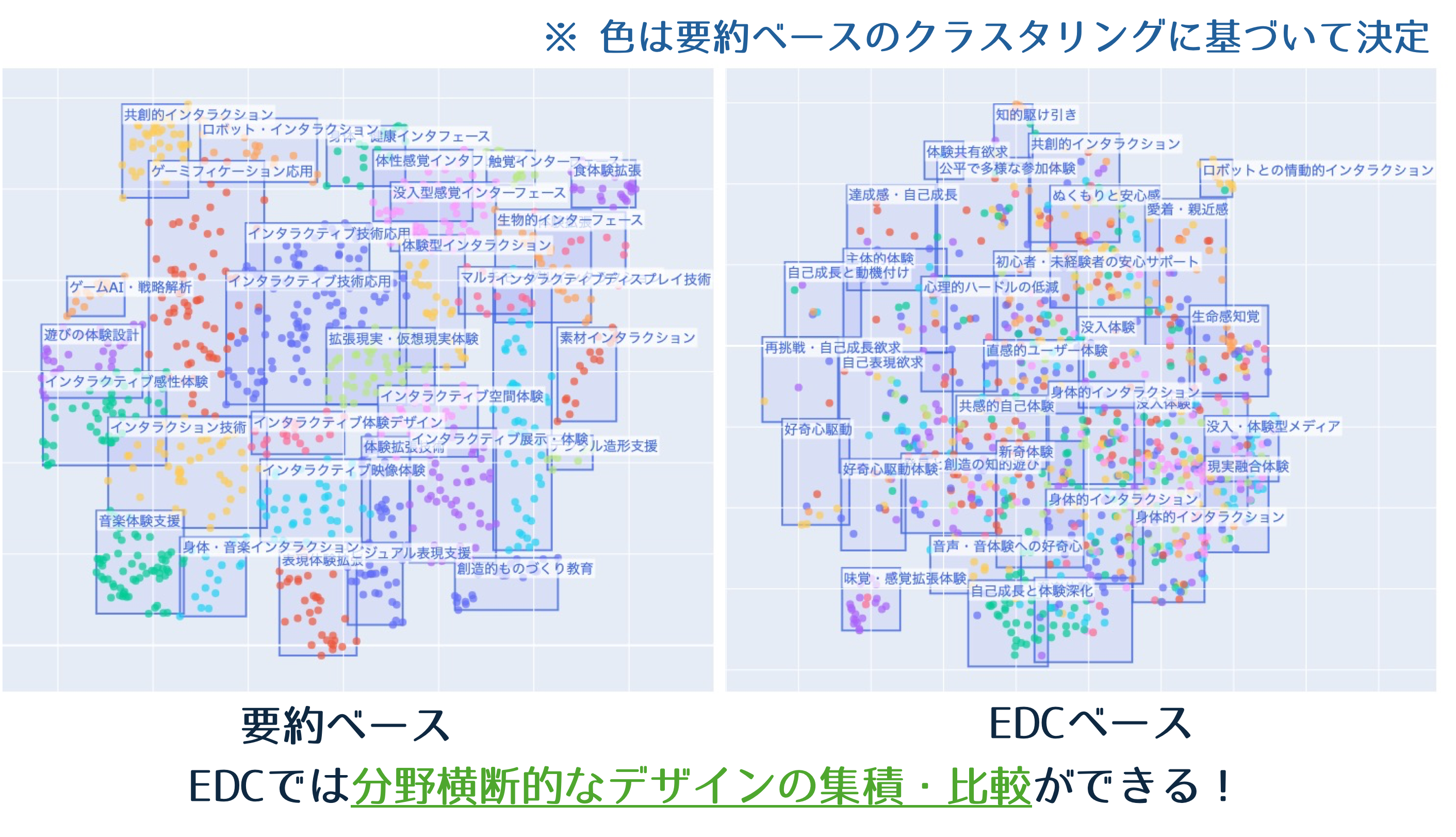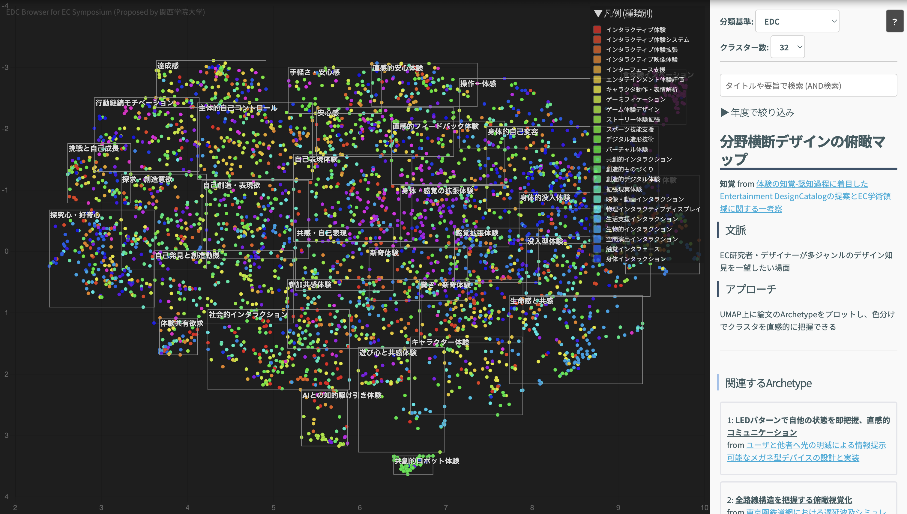 可視化は論文要約ベースのものとArchetypeベースのものの2種類が用意されている。 各点の色は要約ベースにおけるクラスタリングに基づいて彩色されており、 EDCベースの点の色の分布を見ることで、論文要約ベースとどう分類が異なるかを観察できる。